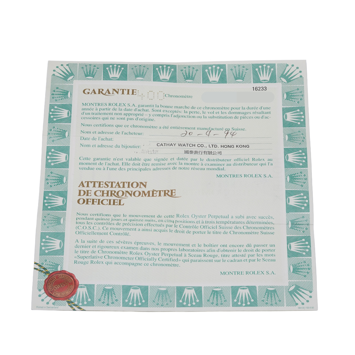 - メーカー保証書( 1994年4月海外購入)