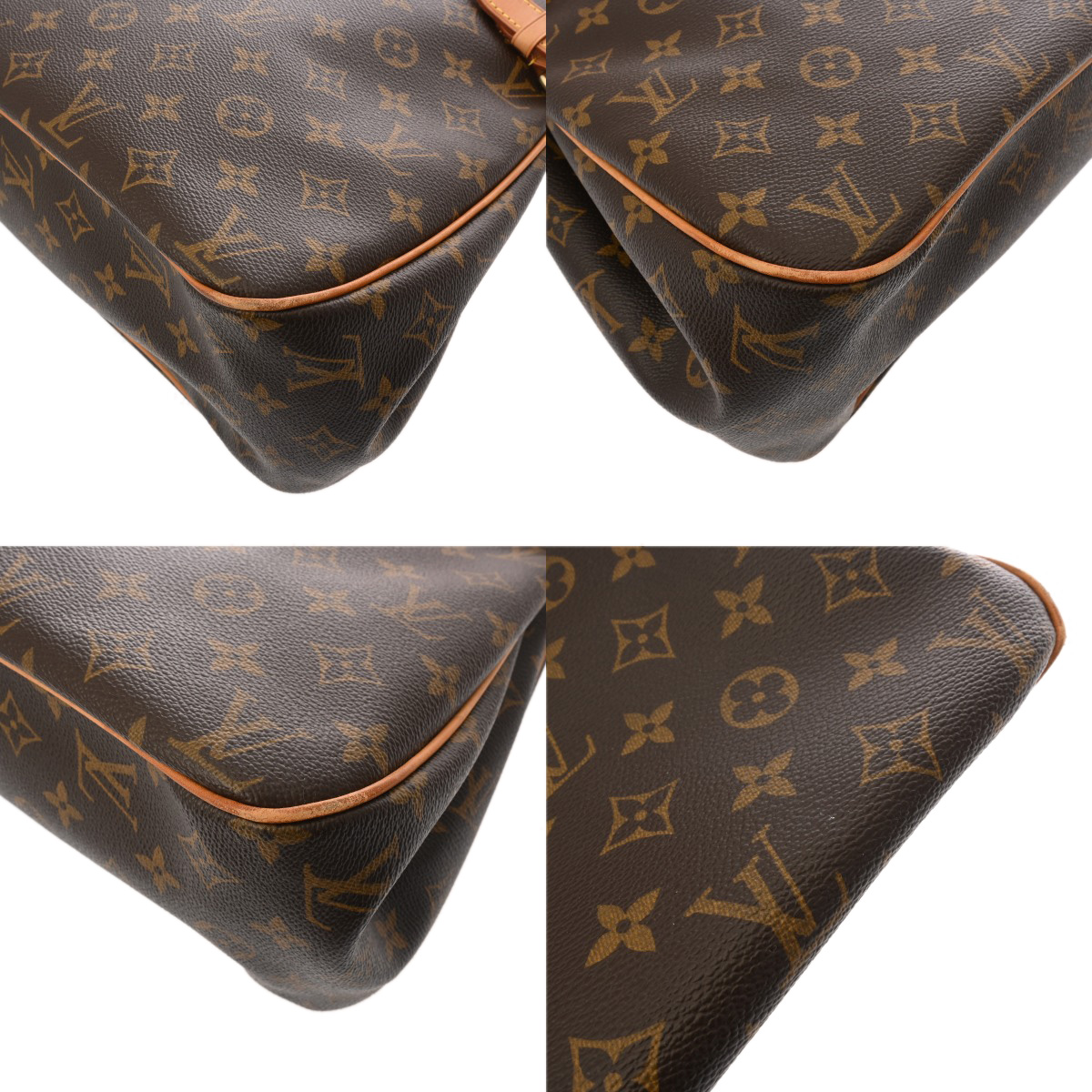 - テカリ、少々たたみクセ、薄汚れ、パイピングやコバにスレ、持ち手にクセ、ヌメ革にヤケやシミ、シワ、金具部分にくすみなど少々使用感がございます。