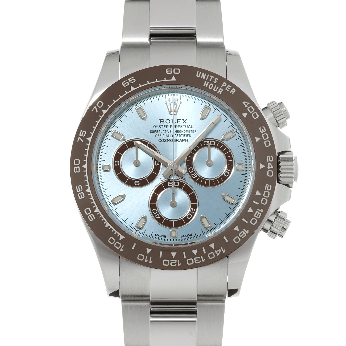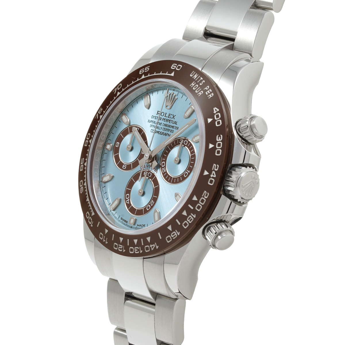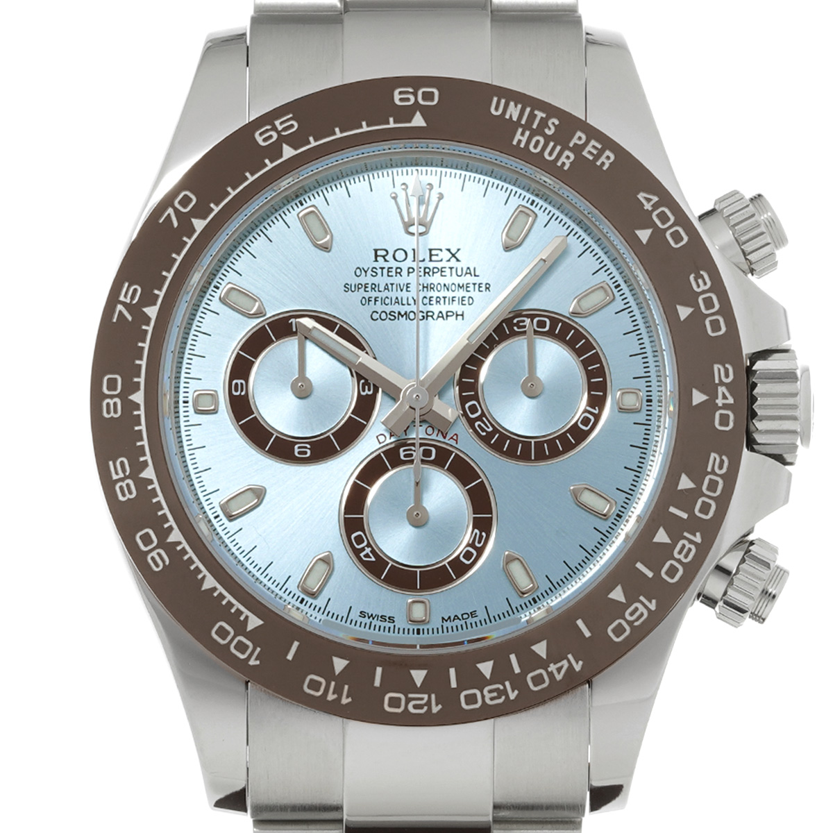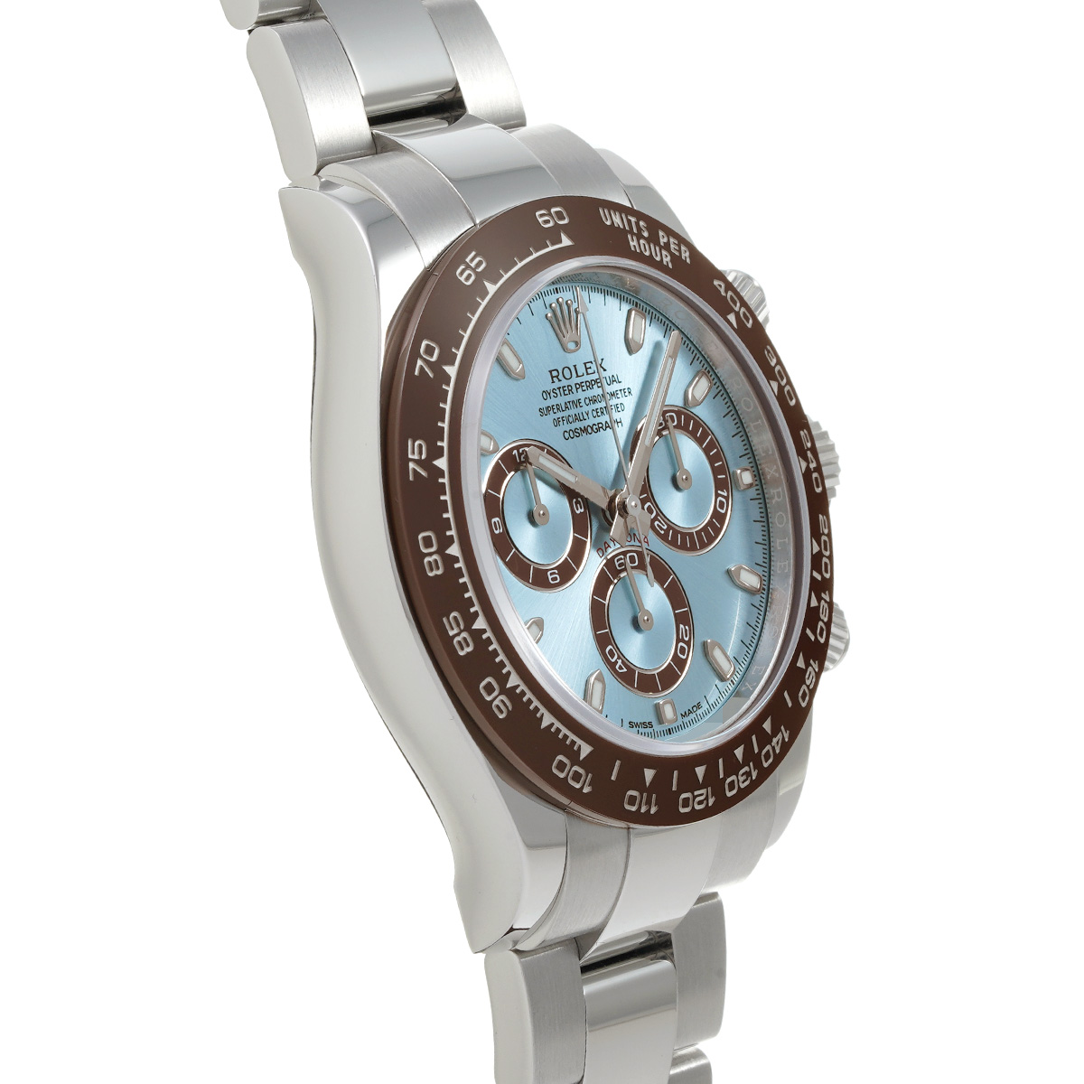 プラチナモデルのみに使用が許されるアイスブルーの文字盤と、チェストナットブラウンのセラクロムベゼル、そしてプラチナモデルならではの圧倒的な存在感は、これを手にする人に鮮烈な印象を与えます。