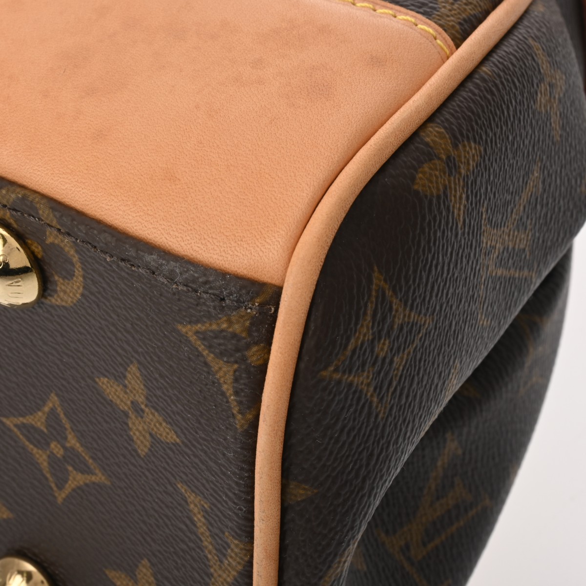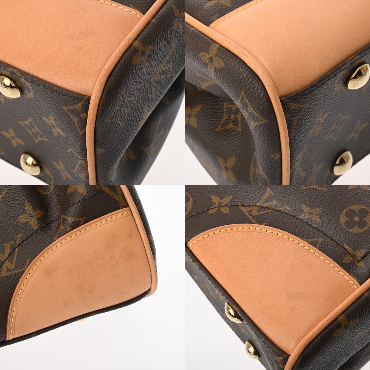 - 薄汚れ、スレ、ヌメ革にヤケやシミ、底鋲含め金具にスレキズが若干ございます。