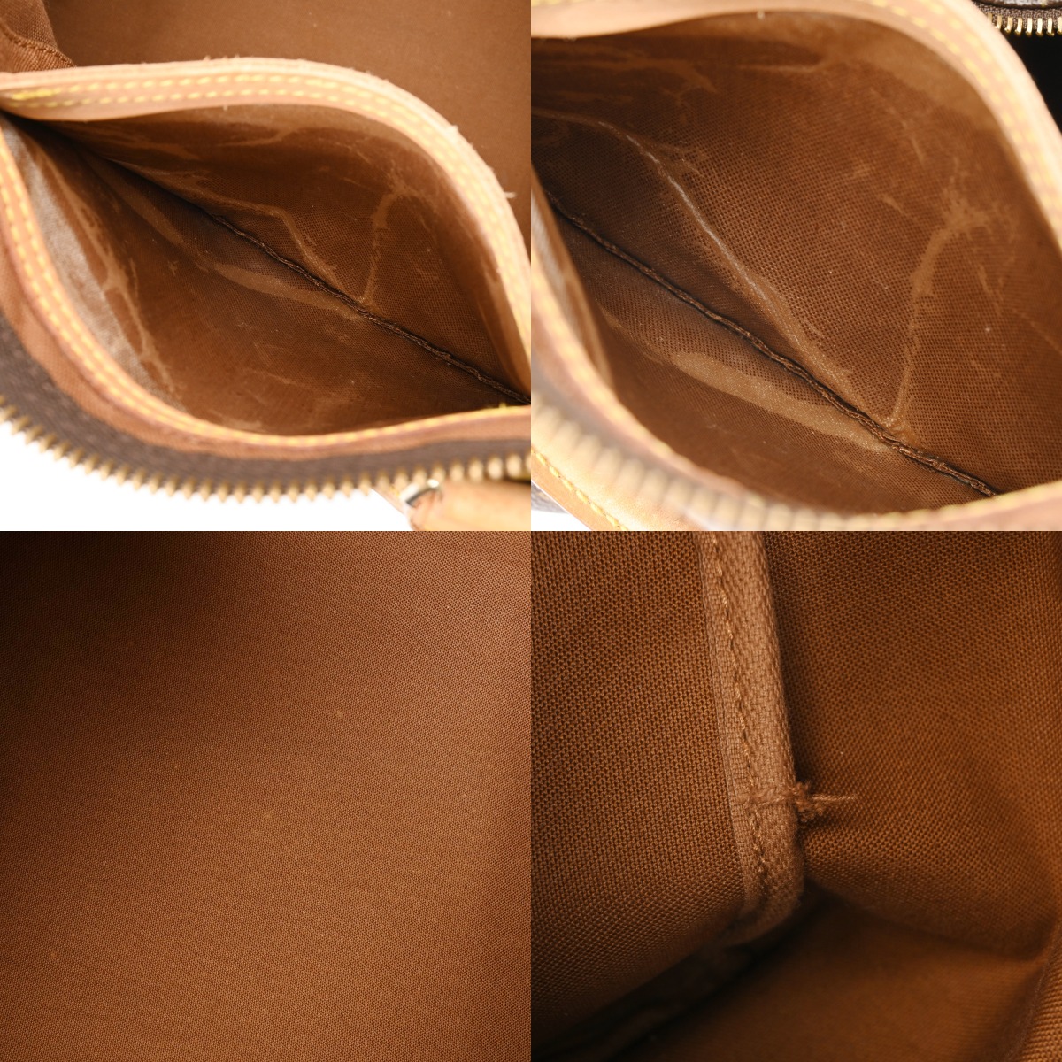 - 変色、薄汚れ、毛羽立ち、ヌメ革にシワ、ヤケ、ポケット内に浮きなどダメージ、金具に色ハゲ、青銅付着など使用感がございます。