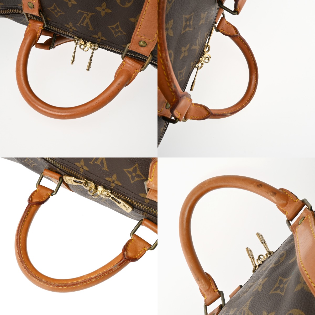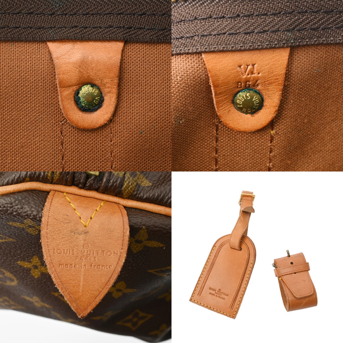 - たたみくせ、薄汚れ、テカリ、コバスレ、ハゲ、ヌメ革部分にヤケ、シミなど使用感、金具部分に変色や青錆の付着など使用感がございます。