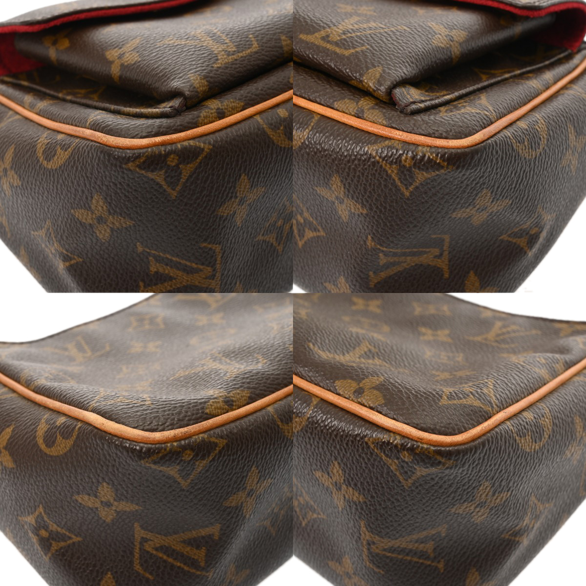 - つぶれ、テカリ、薄汚れやスレ、ヨレ、ショルダーにクセ、ヌメ革にヤケやシミ、シワ、金具にくすみやメッキハガレなど使用感がございます。