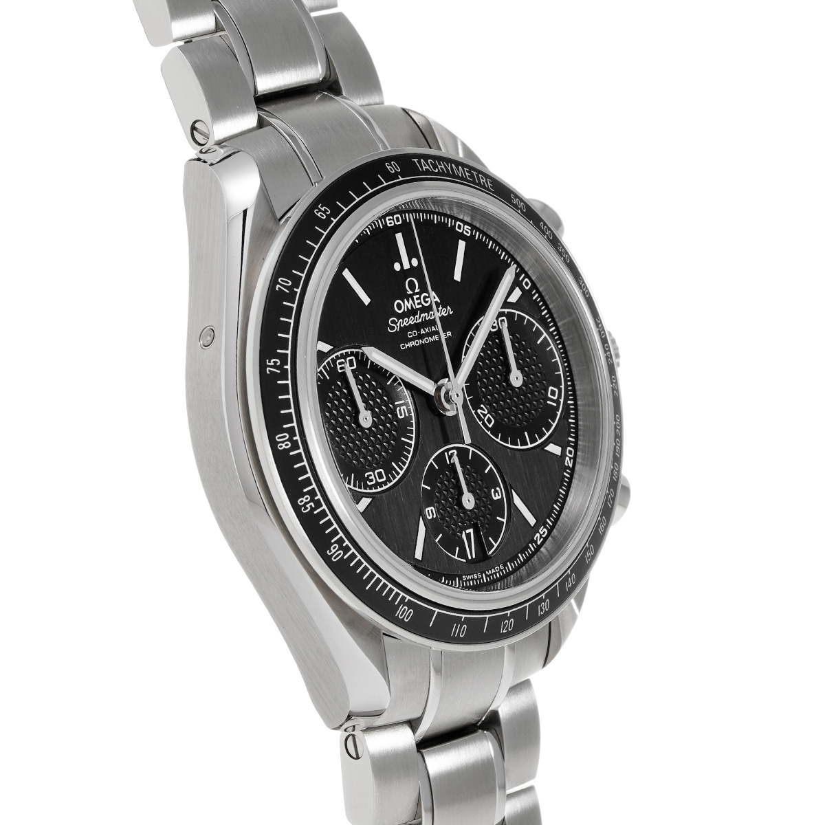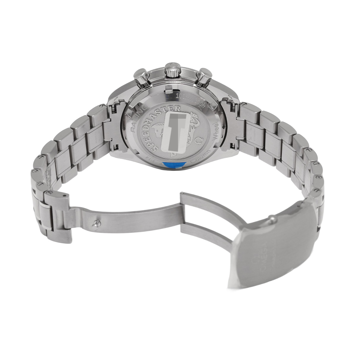 コメントケースを小径化して腕上での収まりの良さを改善すると共に、デイト表示付きの自動巻きムーブメントや100m防水などで、より日常使用に向くモデルとして仕立てた自動巻きのスピードマスターは、歴代モデルのすべてが大変に人気の高いものになっていますが、こちらは2012年にコーアクシャル脱進機とコラムホイール式のクロノグラフ機構を搭載して大幅にグレードアップしたレーシングです。