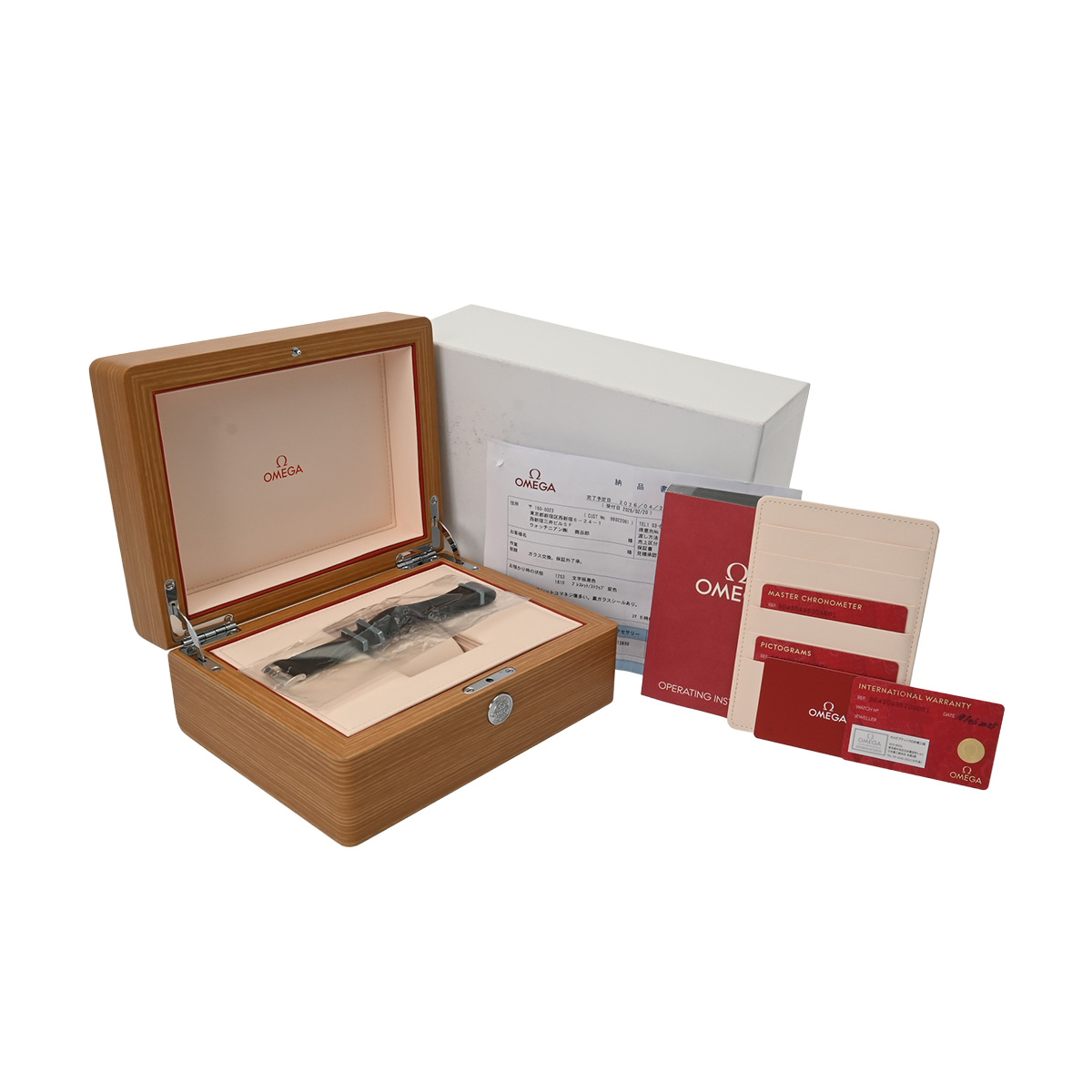 - メーカー保証書( 2025年2月国内購入) / 替えベルト( ナイロン/ブラック) / メーカー箱(劣化)/冊子/ピクトグラム/クロノメーター証明書 / 納品書(2026年4月サファイアガラス交換他)