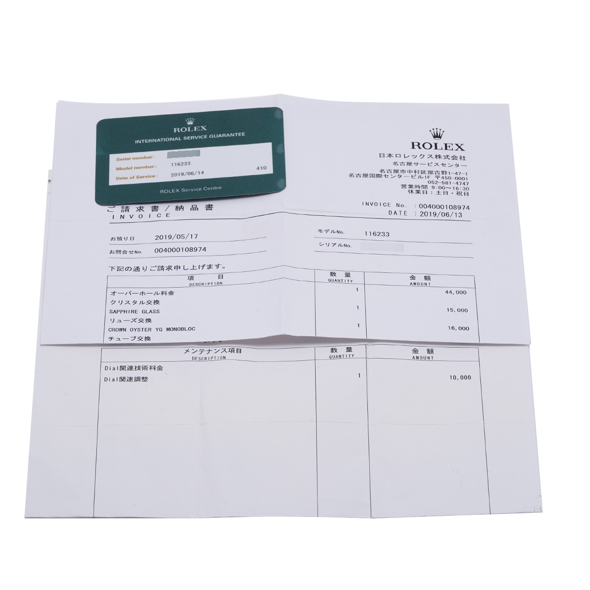 - メーカー箱(ダメージ) / ご請求書/納品書(2011年7月Dial関連調整/2019年6月オーバーホール他)国際サービス保証書(2019年6月オーバーホール)