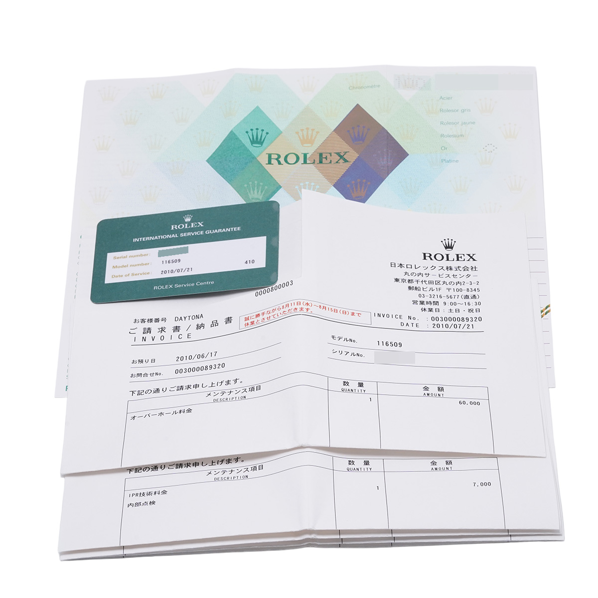 - メーカー保証書( 2005年1月海外購入) / メーカー箱/タグ / ご請求書/納品書(ご請求書/納品書(2012年10月/2012年4月/2011年7月/2010年7月内部点検他)国際サービス保証書(2010年7月オーバーホール))