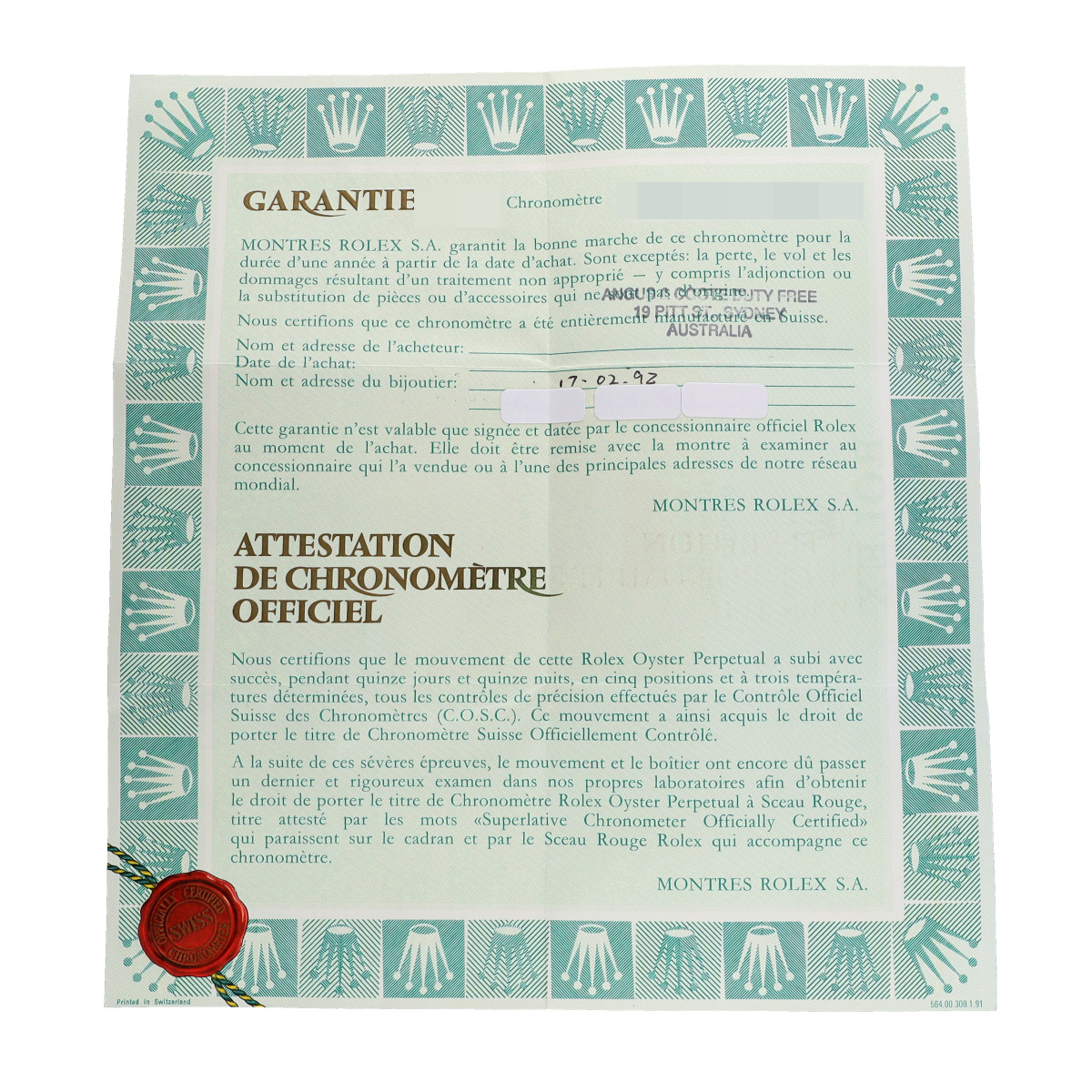 - メーカー保証書( 1992年2月海外購入) / タグ