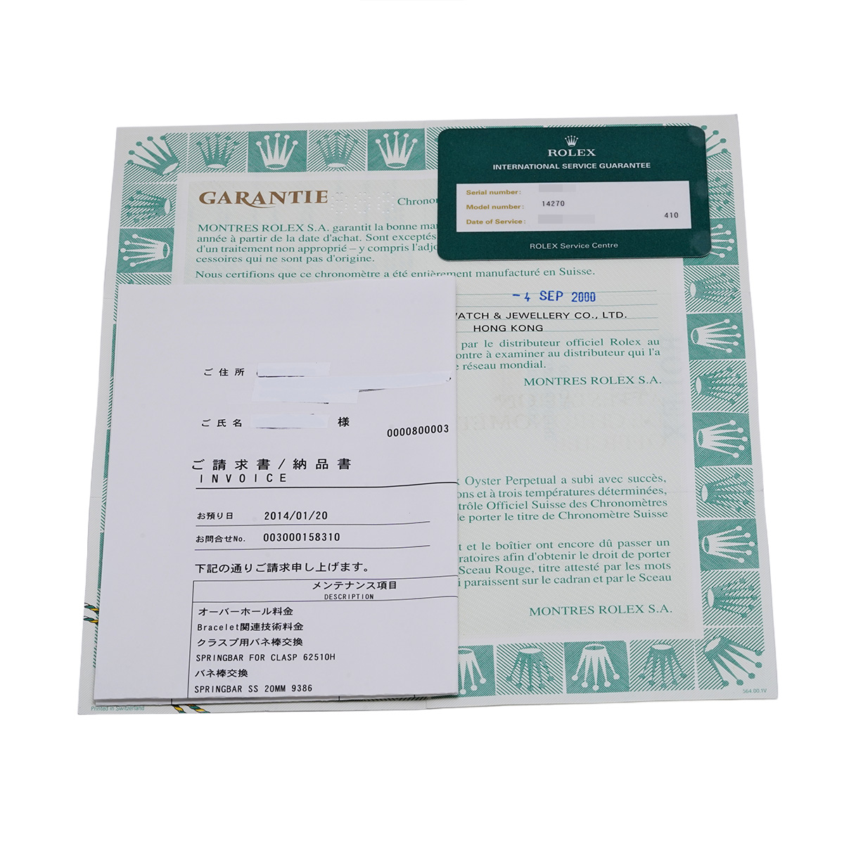 - メーカー保証書( 2000年9月海外購入) / メーカー箱/冊子 / 国際サービス保証書(2014年2月オーバーホール) 修理明細書(2014年2月内部部品交換他)