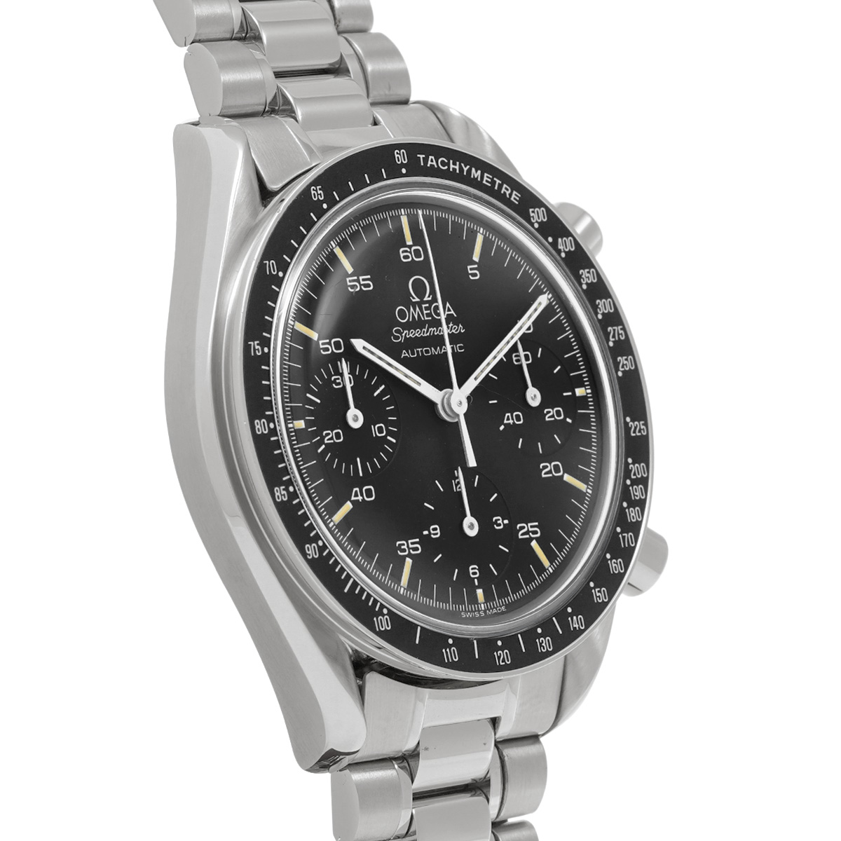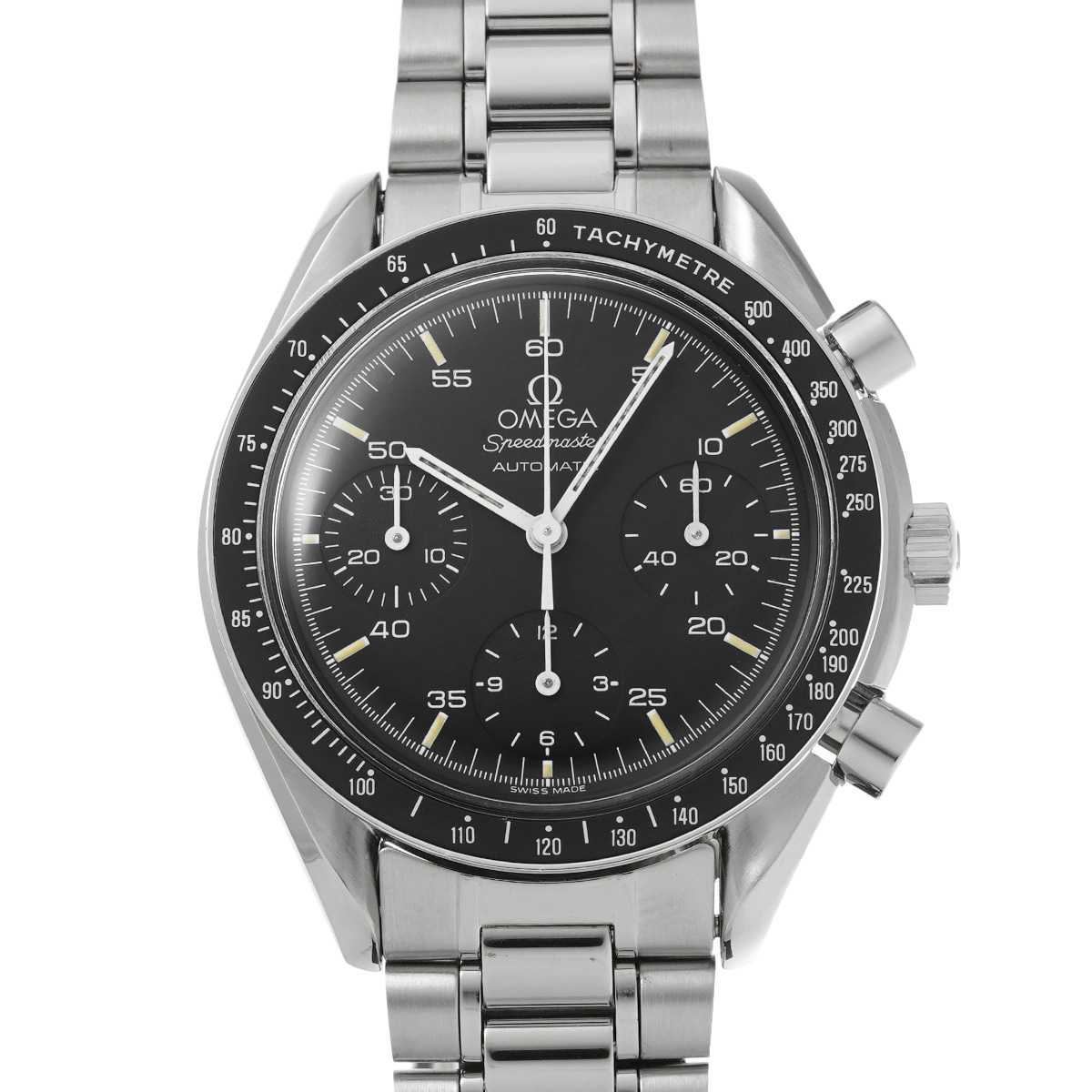 コメントこのスピードマスター リデュースドとも呼ばれるモデルは、オメガの代表的な時計であるスピードマスター プロフェッショナルのツールとして研ぎ澄まされた精悍さはそのままに、ケース径を39ミリに縮小して腕上での収まりを改善すると共に、自動巻きムーブメントの採用によって利便性を向上させることで、より多くの人々の日常に寄り添える時計を目指したものです。