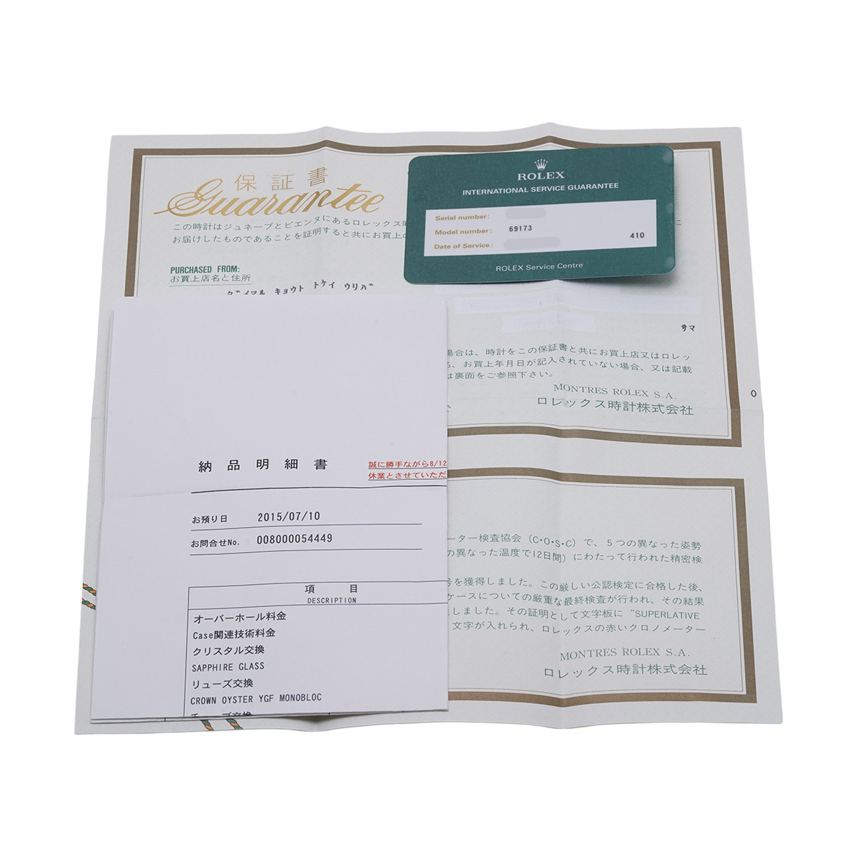 - メーカー保証書( 1998年8月国内購入) / 納品明細書(2015年8月オーバーホール他)国際サービス保証書(2015年8月オーバーホール)