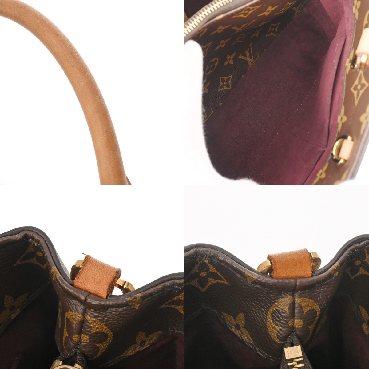 - つぶれやテカリ、ヌメ革にヤケ、薄汚れ、スレ、持ち手にヨレなどのダメージ、底鋲含め金具に色ハゲなど使用感がございます。