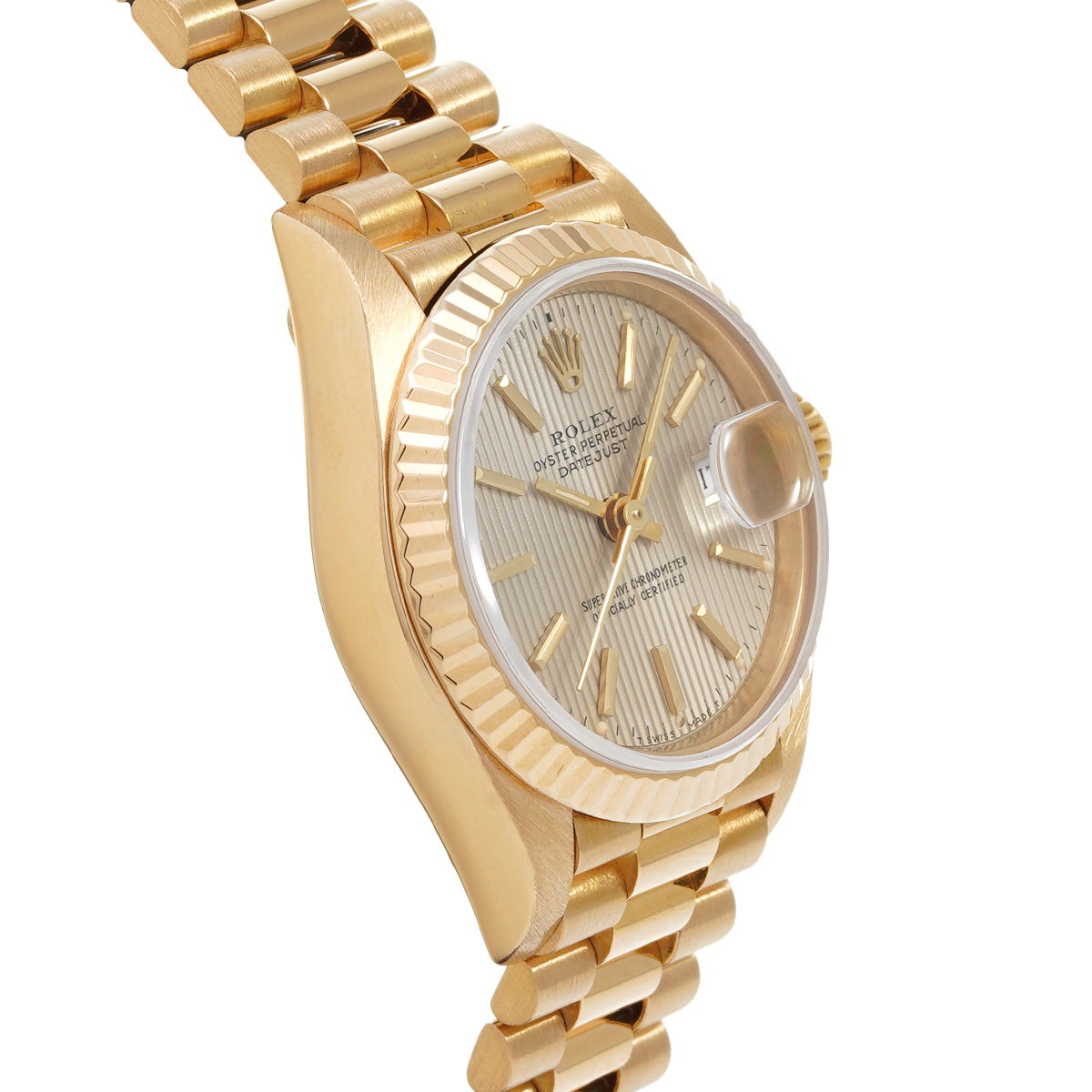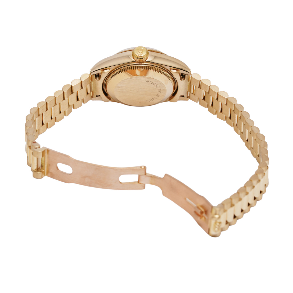 それから四半世紀の歳月を経て進化したこの世代のレディ デイトジャストの中でも、このゴールドモデルはもちろん特別な存在であり、最高峰の証であるプレジデントブレスレットがフィットされているほか、様々なジュエリーピースのベースモデルとして多く用いられています。 -