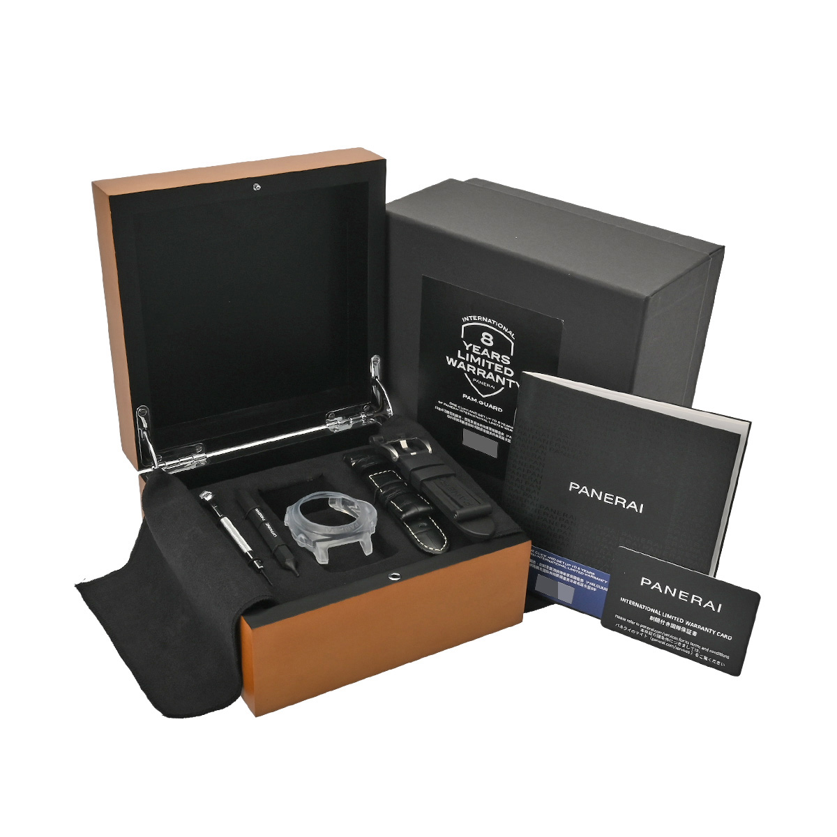 - メーカー保証書( 2022年5月購入) / 替えベルト( ラバー/ブラック アリゲーター/ブラック) / メーカー箱(ダメージ)