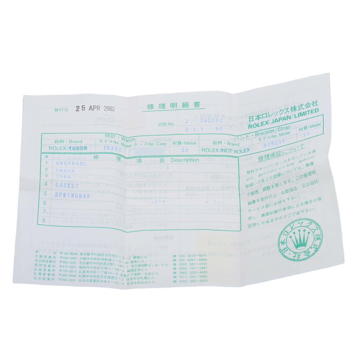 - 内箱(ダメージ) / 修理明細書(2002年4月オーバーホール他)