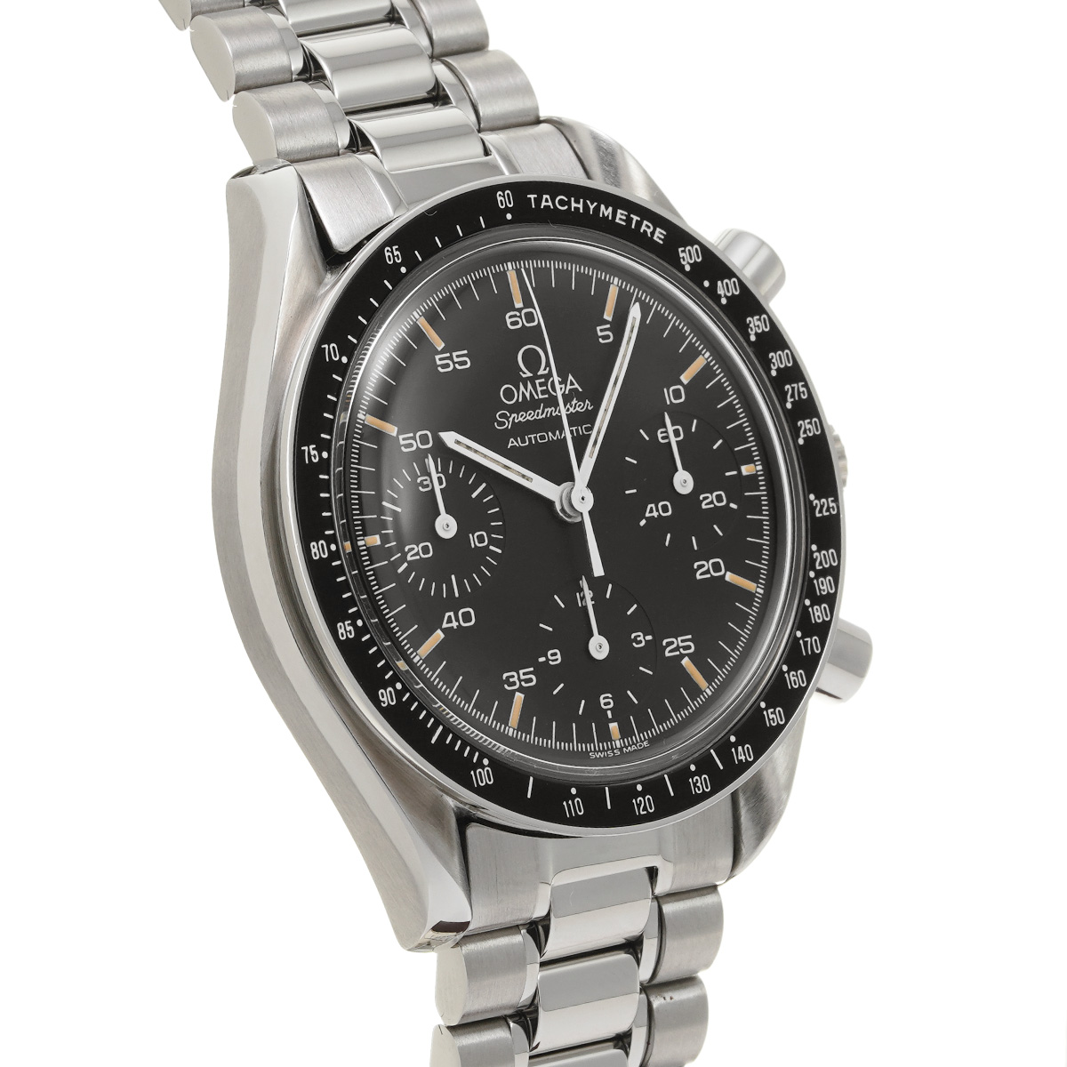 コメントこのスピードマスター リデュースドとも呼ばれるモデルは、オメガの代表的な時計であるスピードマスター プロフェッショナルのツールとして研ぎ澄まされた精悍さはそのままに、ケース径を39ミリに縮小して腕上での収まりを改善すると共に、自動巻きムーブメントの採用によって利便性を向上させることで、より多くの人々の日常に寄り添える時計を目指したものです。