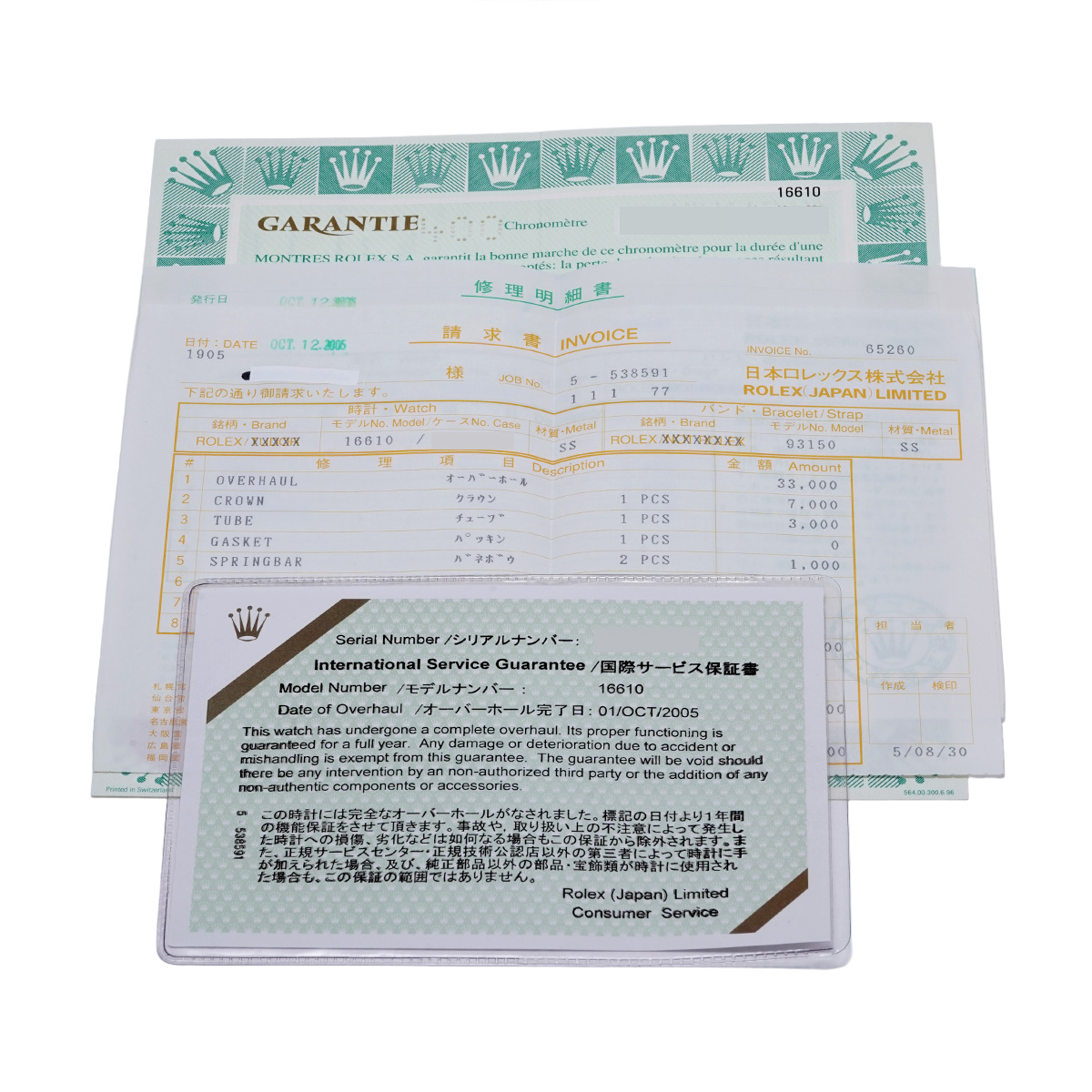 - メーカー保証書( 1997年1月海外購入) / メーカー箱/冊子 / 請求書(2005年10月オーバーホール他)国際サービス保証書(2005年10月オーバーホール)