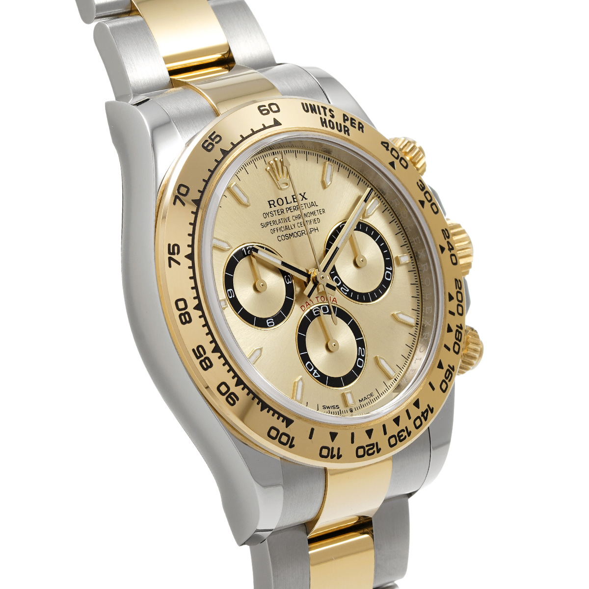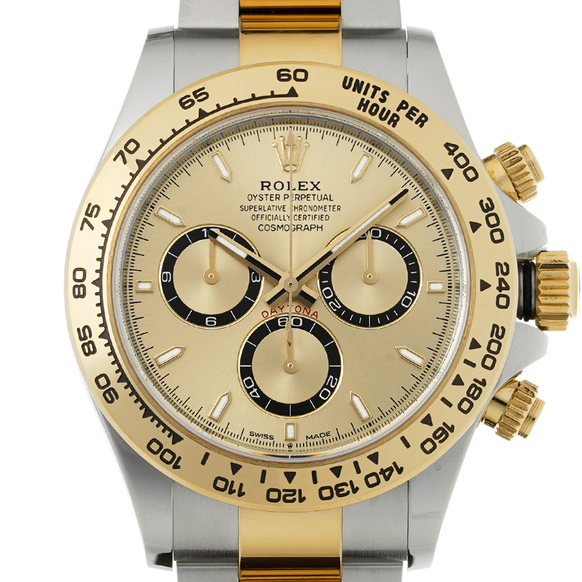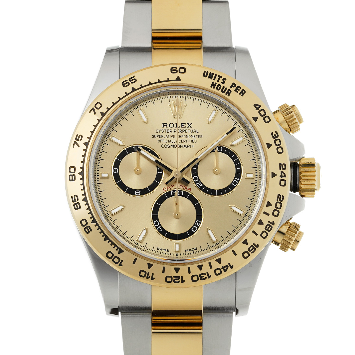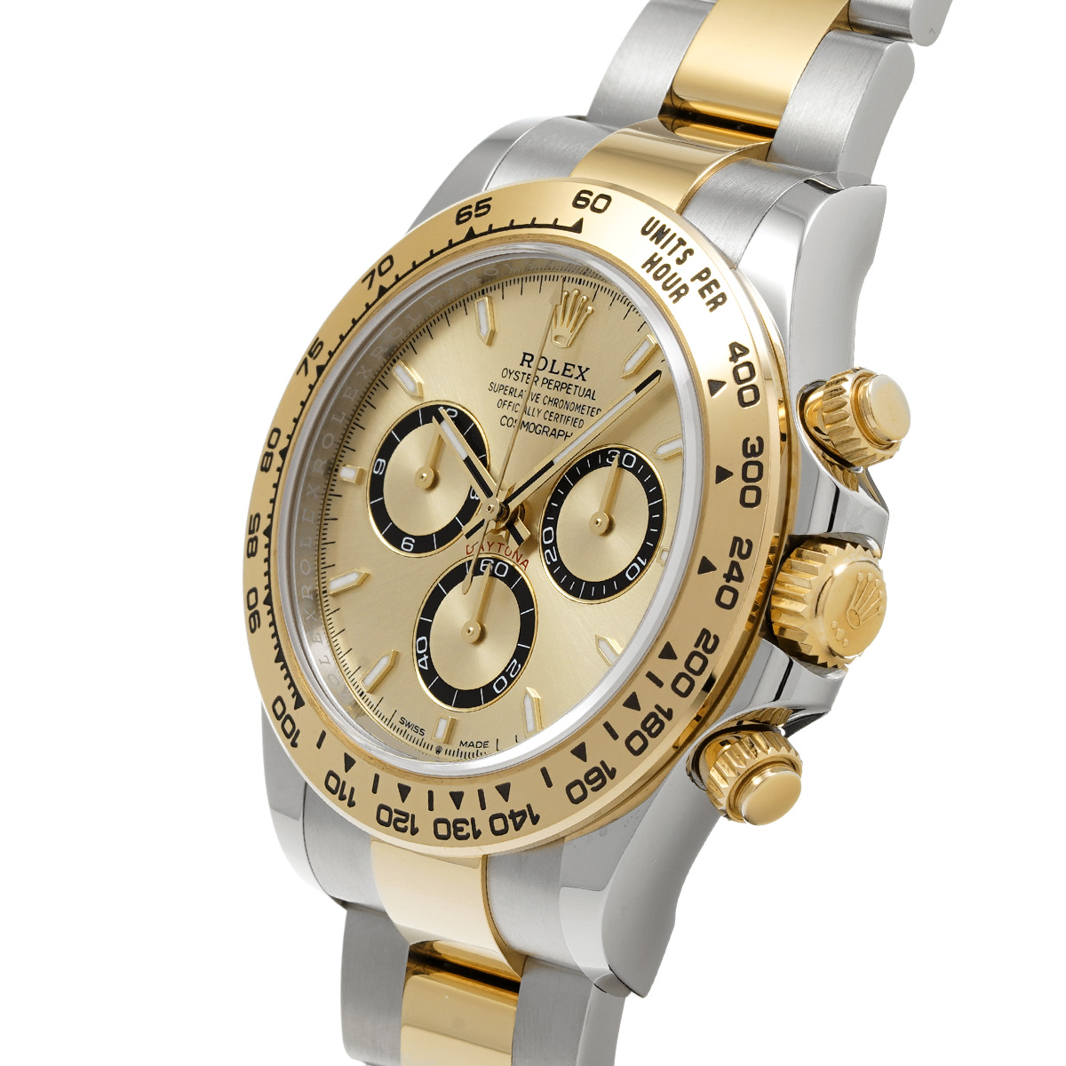 コメント現代最高の機械式クロノグラフのひとつ、コスモグラフ デイトナの、スチールとイエローゴールドのコンビ(=イエローロレゾール)の外装を持つモデルです。