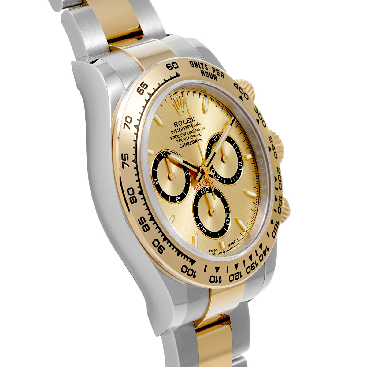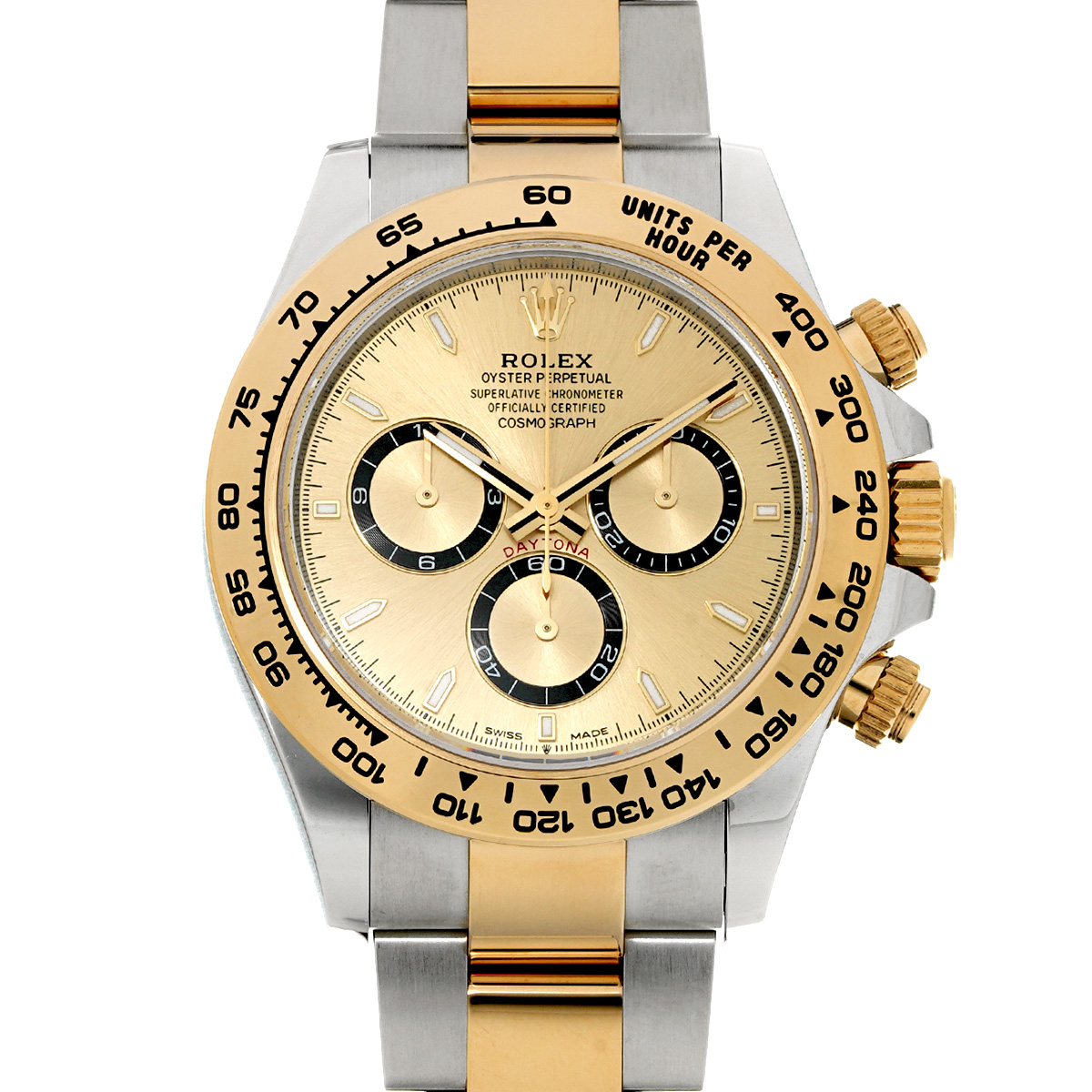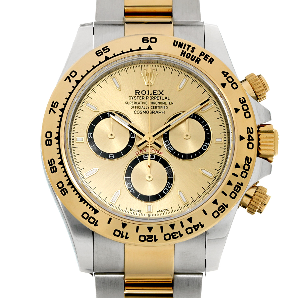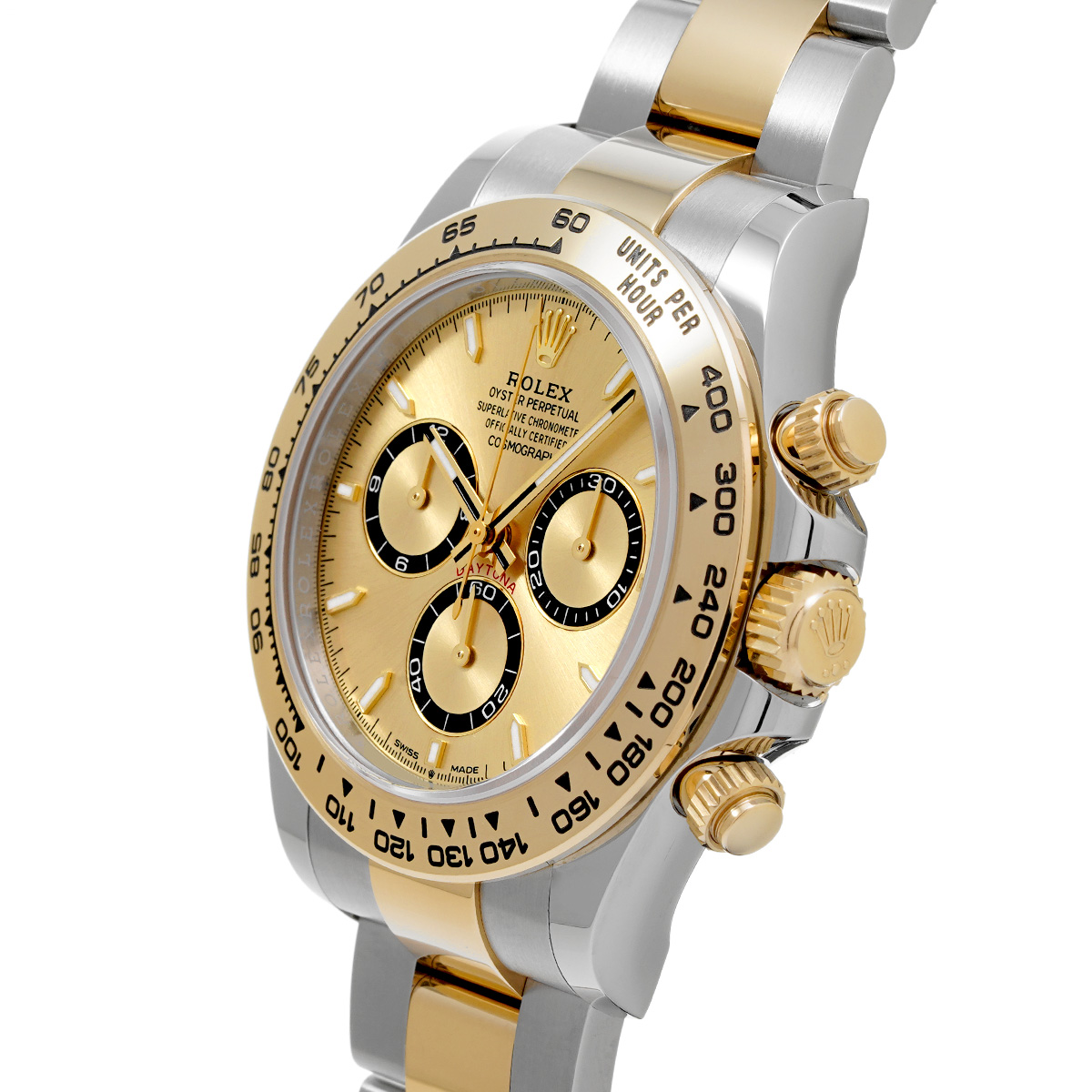コメント現代最高の機械式クロノグラフのひとつ、コスモグラフ デイトナの、スチールとイエローゴールドのコンビ(=イエローロレゾール)の外装を持つモデルです。