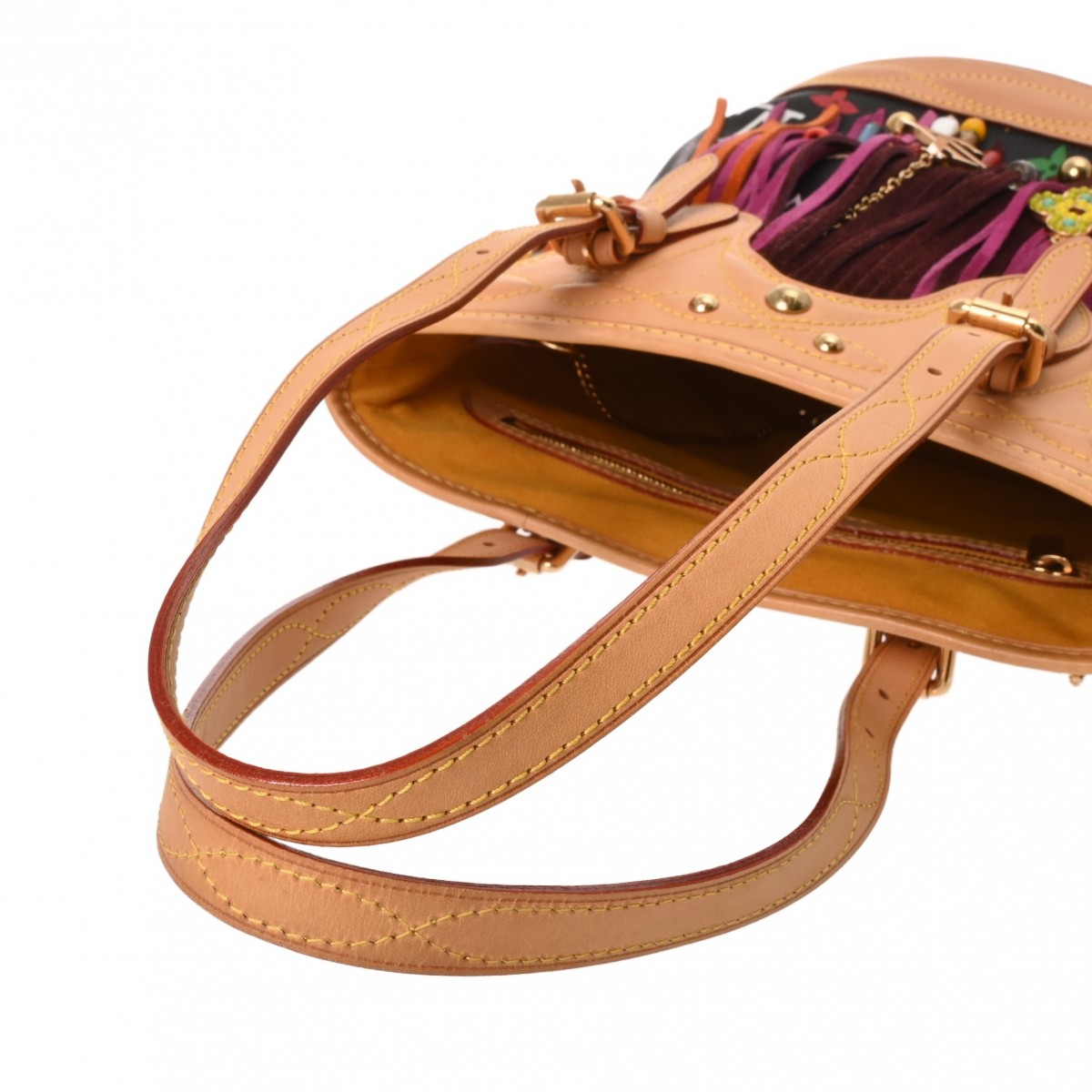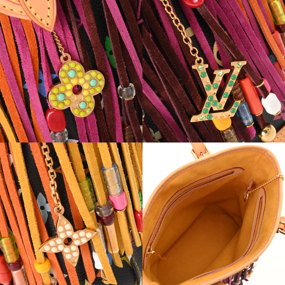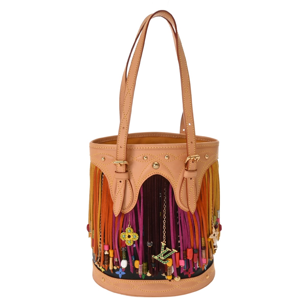 - たたみクセ、ヌメ革ヤケ、シミ、ショルダーにクセ、フリンジに毛の乱れ、毛羽立ち、金具にスリキズなど少々使用感がございます。※一部のビーズに欠損がございます。