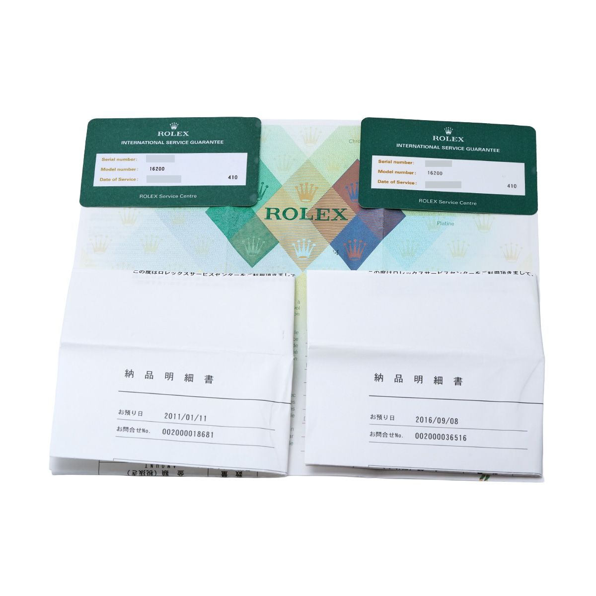 - メーカー保証書( 2005年9月海外購入) / メーカー箱/冊子 / 納品明細書(2011年2月/2016年10月オーバーホール他)国際サービス保証書(2011年2月/2016年10月オーバーホール)