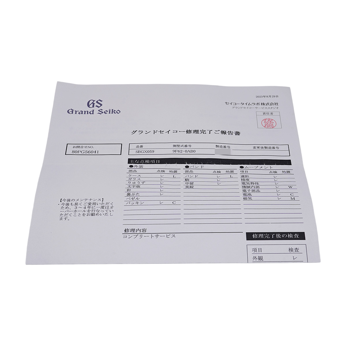 - グランドセイコー修理完了後報告書(2023年8月コンプリートサービス)