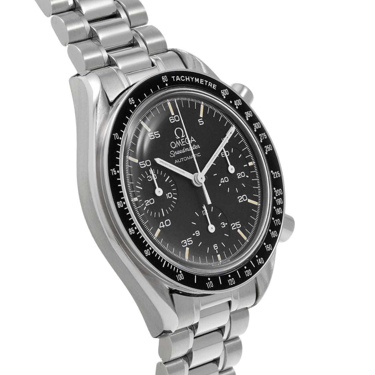 コメントこのスピードマスター リデュースドとも呼ばれるモデルは、オメガの代表的な時計であるスピードマスター プロフェッショナルのツールとして研ぎ澄まされた精悍さはそのままに、ケース径を39ミリに縮小して腕上での収まりを改善すると共に、自動巻きムーブメントの採用によって利便性を向上させることで、より多くの人々の日常に寄り添える時計を目指したものです。
