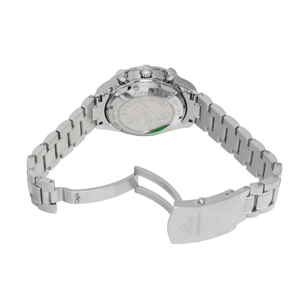コメントケースを小径化して腕上での収まりの良さを改善すると共に、デイト表示付きの自動巻きムーブメントや100m防水などで、より日常使用に向くモデルとして仕立てた自動巻きのスピードマスターは、歴代モデルのすべてが大変に人気の高いものになっていますが、こちらは2012年にコーアクシャル脱進機とコラムホイール式のクロノグラフ機構を搭載して大幅にグレードアップしたレーシングです。