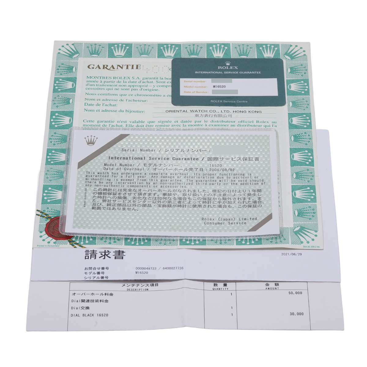 - メーカー保証書( 1996年7月海外購入) / メーカー箱(ダメージ)/タグ / ご請求書/納品書(2006年/2021年6月オーバーホール他)国際サービス保証書(2006年8月/2021年6月オーバーホール)