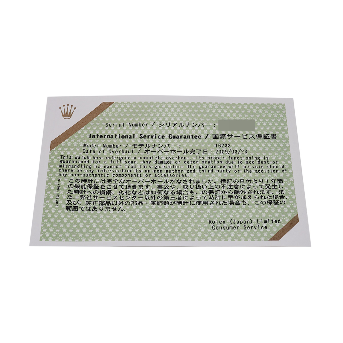 - 国際サービス保証書(2009年3月オーバーホール)