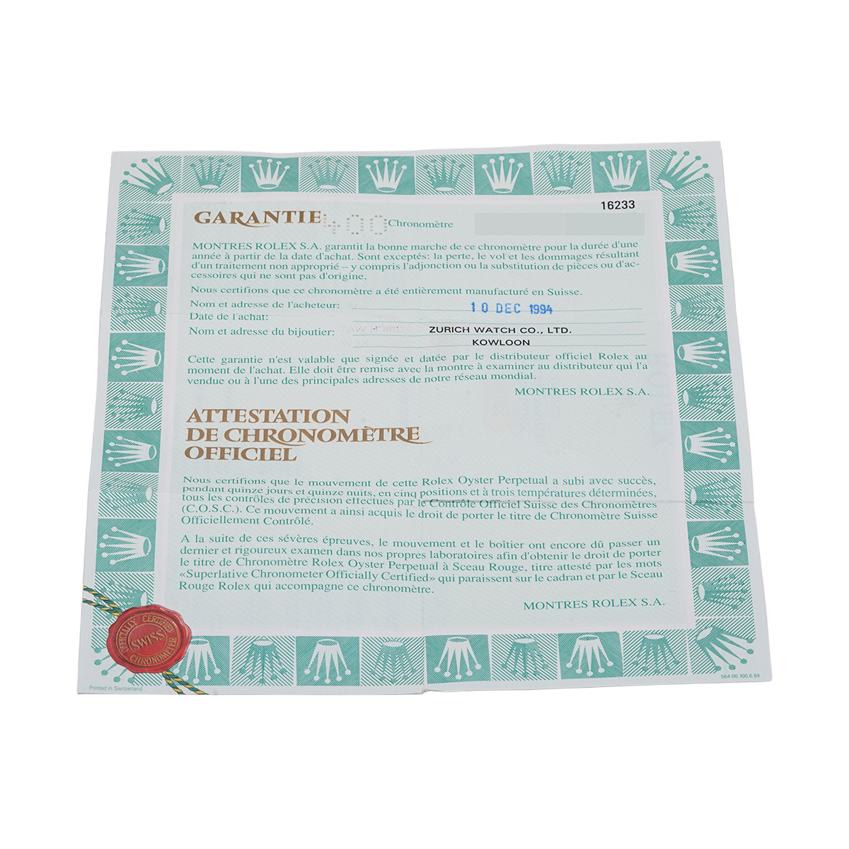 - メーカー保証書( 1994年12月海外購入) / タグ