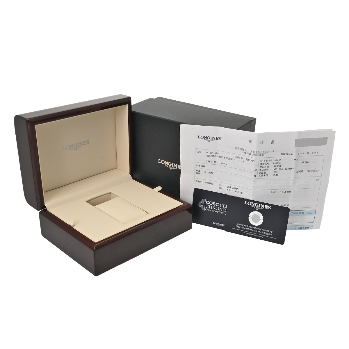 - メーカー保証書( 2023年1月国内購入) / メーカー箱/クロノメーター証明書 / 納品書(2025年5月メンテナンスサービス)