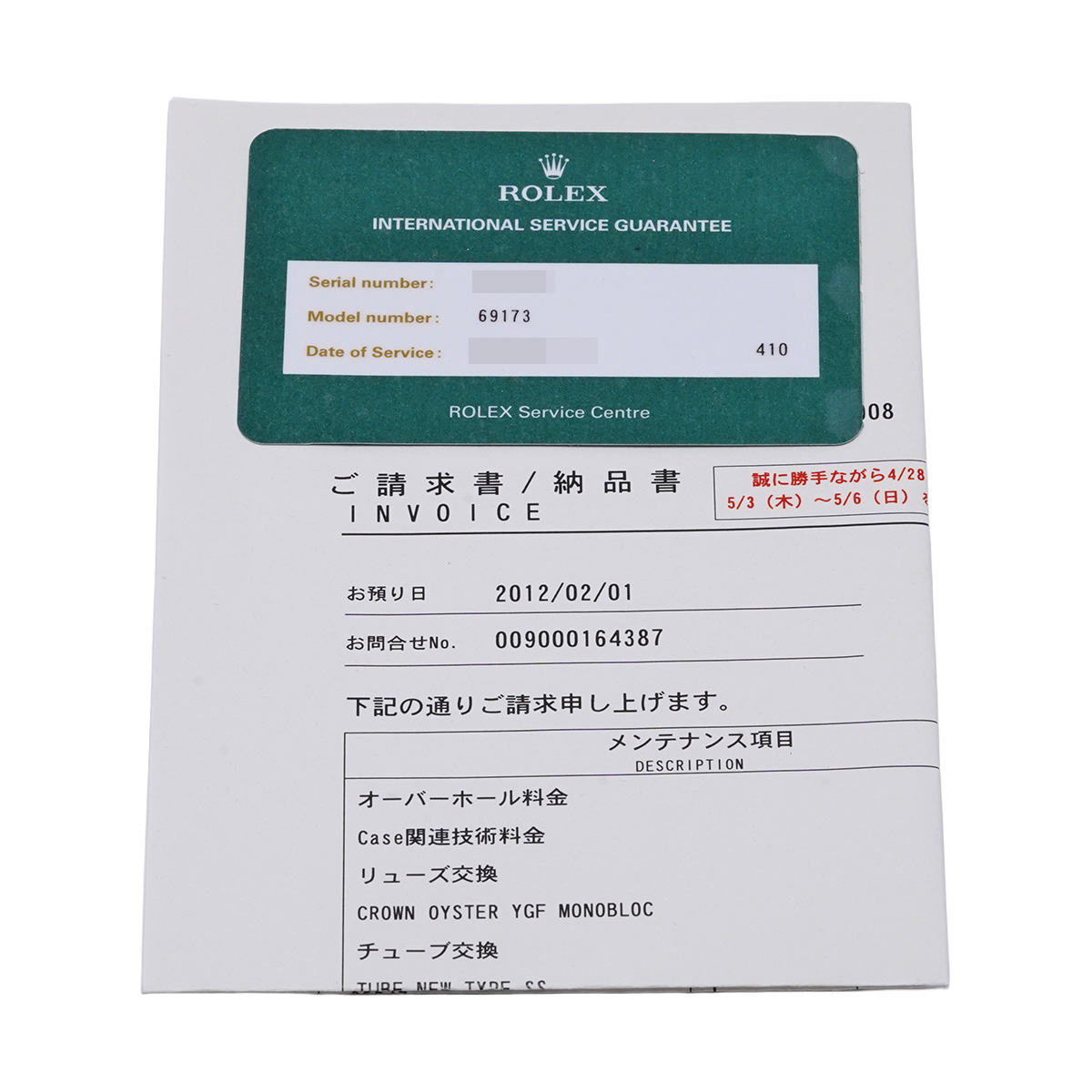 - メーカー箱(ダメージ) / ご請求書/納品書(2012年3月オーバーホール他/切り抜き有) 国際サービス保証書(2012年3月オーバーホール)