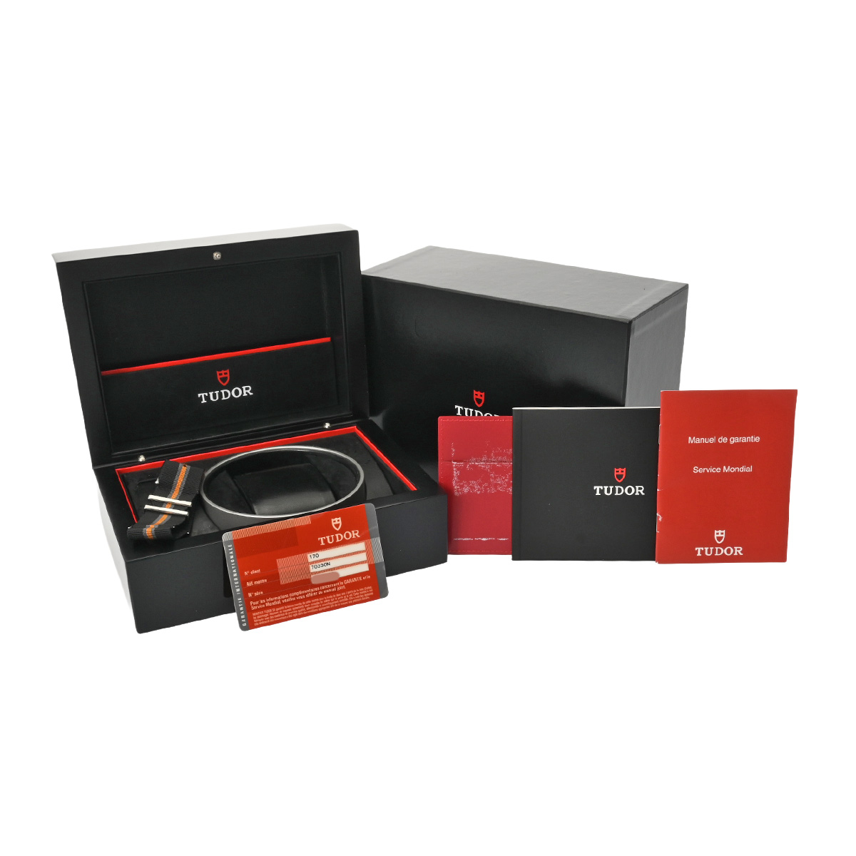 - メーカー保証書( 2011年海外購入) / 替えベルト( ブラック・グレー・オレンジ/ファブリック/僅かな使用感) / メーカー箱(ダメージ)/冊子